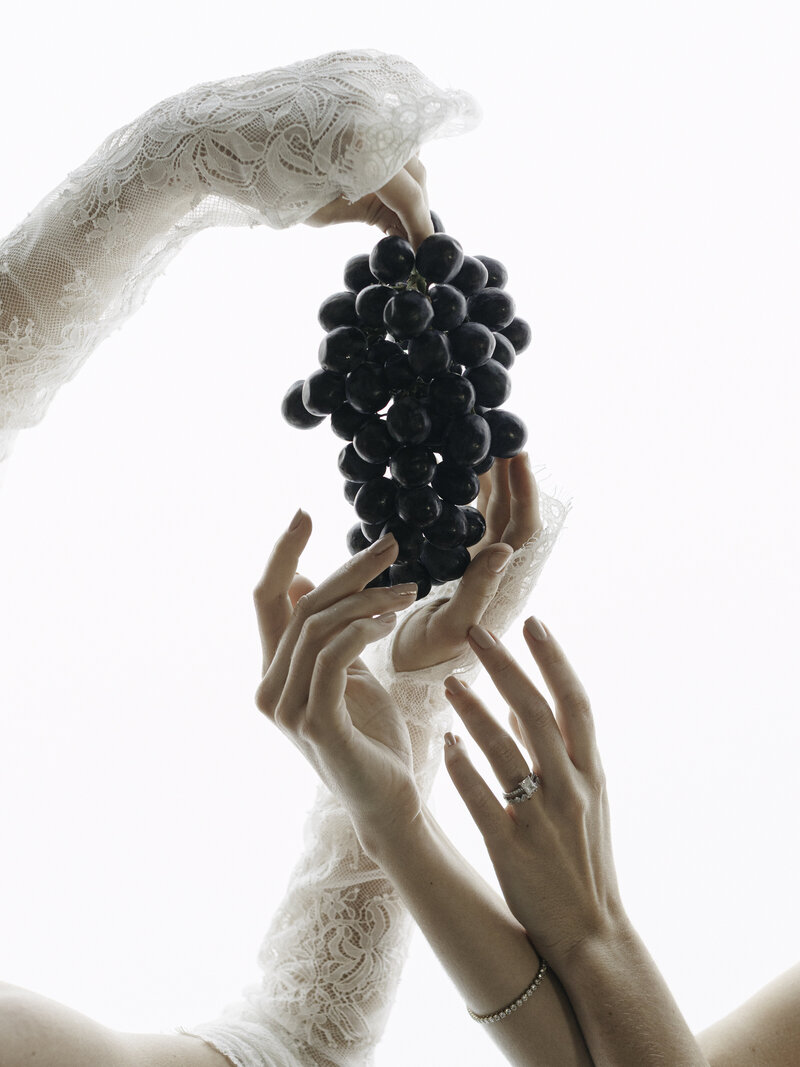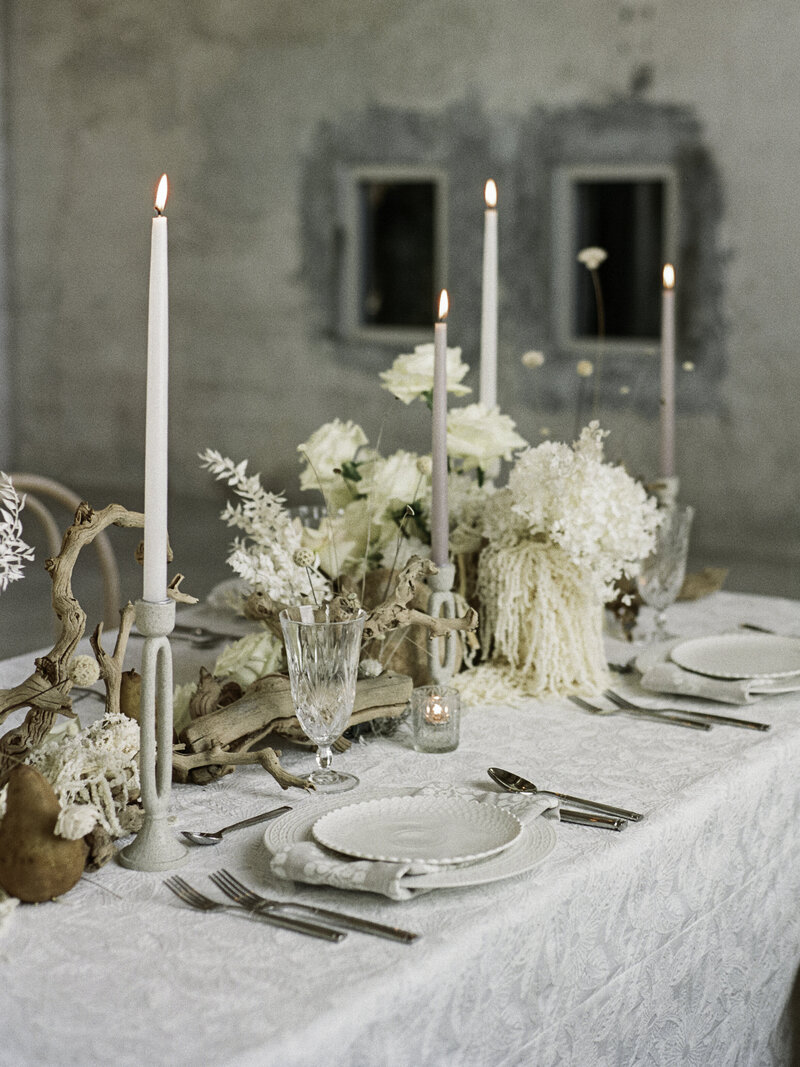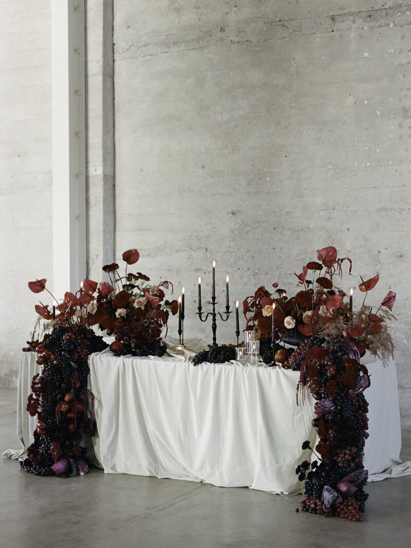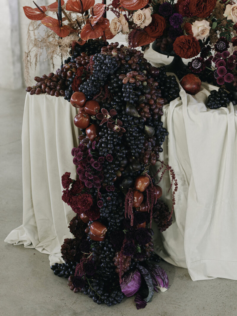 Two distinct tablescapes anchored the design—one avant-garde, built from unexpected elements like grapes, cabbage, and other vegetables, the other a European-inspired study in layered neutrals and texture.